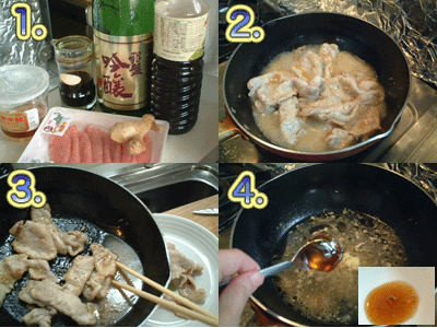 焼き色がついた時点で、ショウガ、酒、醤油をカップに半分ずつかけて、サッとひと煮立ちさせます。(写真の2)味をしっかり付ける必要はありません。肉に熱が通った時点で、一度肉を全て大皿に取り出します。(写真の3)
